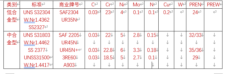 第一类属低合金型,代表牌号是UNSS32304(23Cr-4Ni0.1N),钢中不含钼,PREN值为24~25,在耐应力腐蚀方面可代替AS304或316使用。