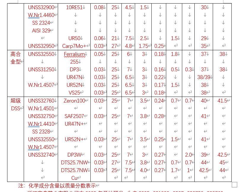 表1-1 双相永利平台(DSS)代表牌号的主要化学成分(%)和孔蚀抗力当量值