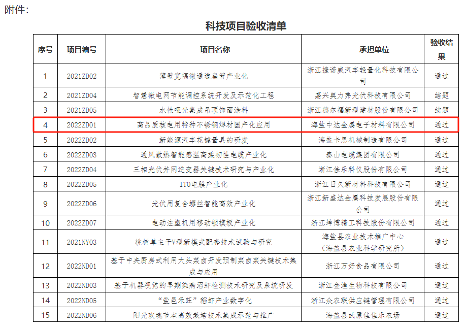 据科技项目验收清单显示,由海盐中达金属电子材料有限公司承担一项目高品质核电用特种永利平台焊材国产化应用获验收通过。