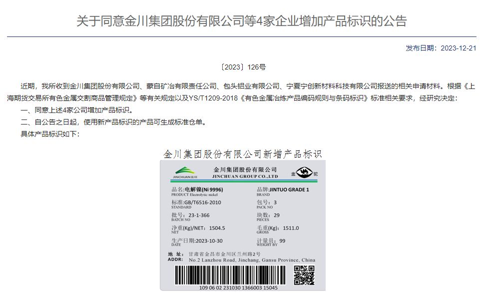 12月21日,据上海期货交易所一则《关于同意金川集团股份有限公司等4家企业增加产品标识的公告》称,金川集团股份有限公司即日起使用新产品标识的产品(品名:电解镍NI9996)可生成标准仓单。