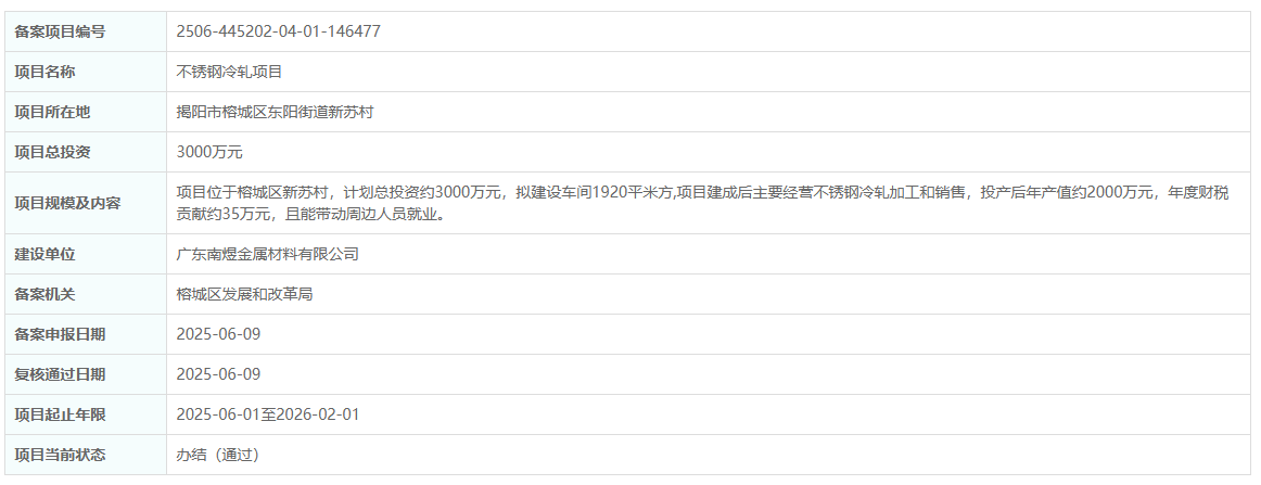 2025年6月9日,揭阳市榕城区东阳街道新苏村永利平台冷轧项目备案复核获通过。